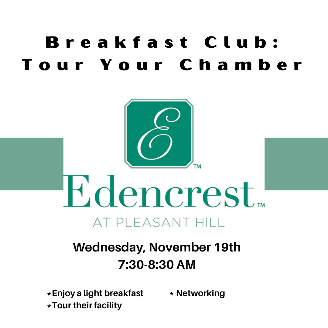 Join us for a special Breakfast Club at Edencrest at Pleasant Hill! Network with fellow members, enjoy a light breakfast, and learn more about Edencrest’s services. This is your chance to tour their facility and see firsthand how they serve the community.