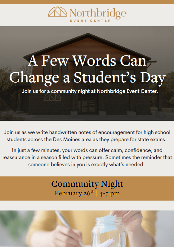 Community members are invited to stop in during the event and write short notes to high school students across the Des Moines area as they head into state exams. Messages that say you have got this. We are proud of you. Take a deep breath.