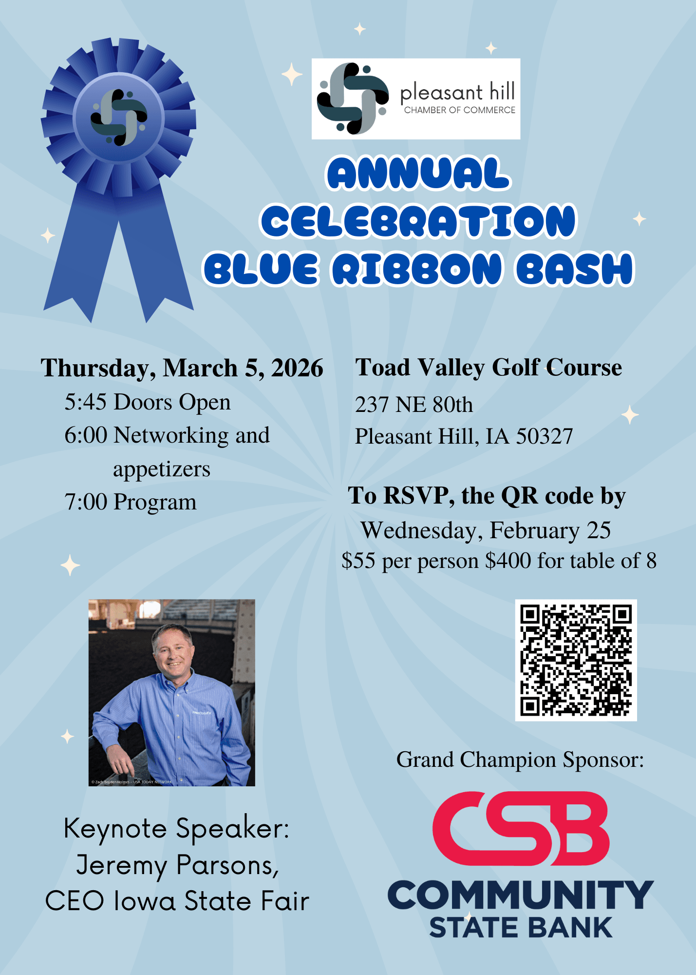 Join us for our Annual Celebration, themed Blue Ribbon Bash – State Fair Style! We’ll be celebrating our organization and honoring this year’s outstanding award winners during an evening full of fun, recognition, and fair-inspired flair. Our keynote speaker this year is Jeremy Parsons, CEO/Manager of the Iowa State Fair!