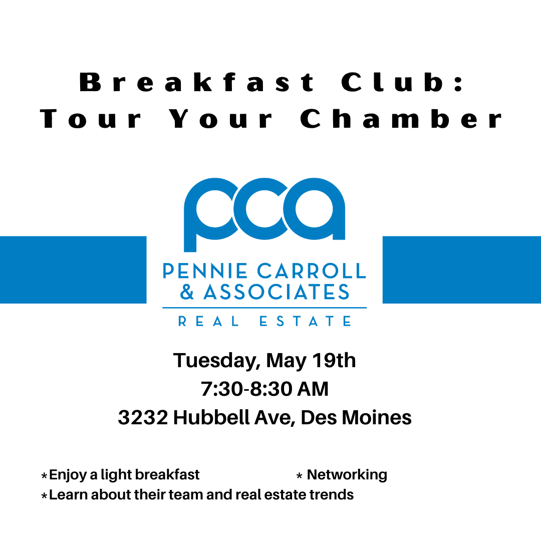 Join us for Breakfast Club: Tour Your Chamber at Pennie Carroll & Associates on Tuesday, May 19th, 7:30–8:30 AM at 3232 Hubbell Ave, Des Moines.